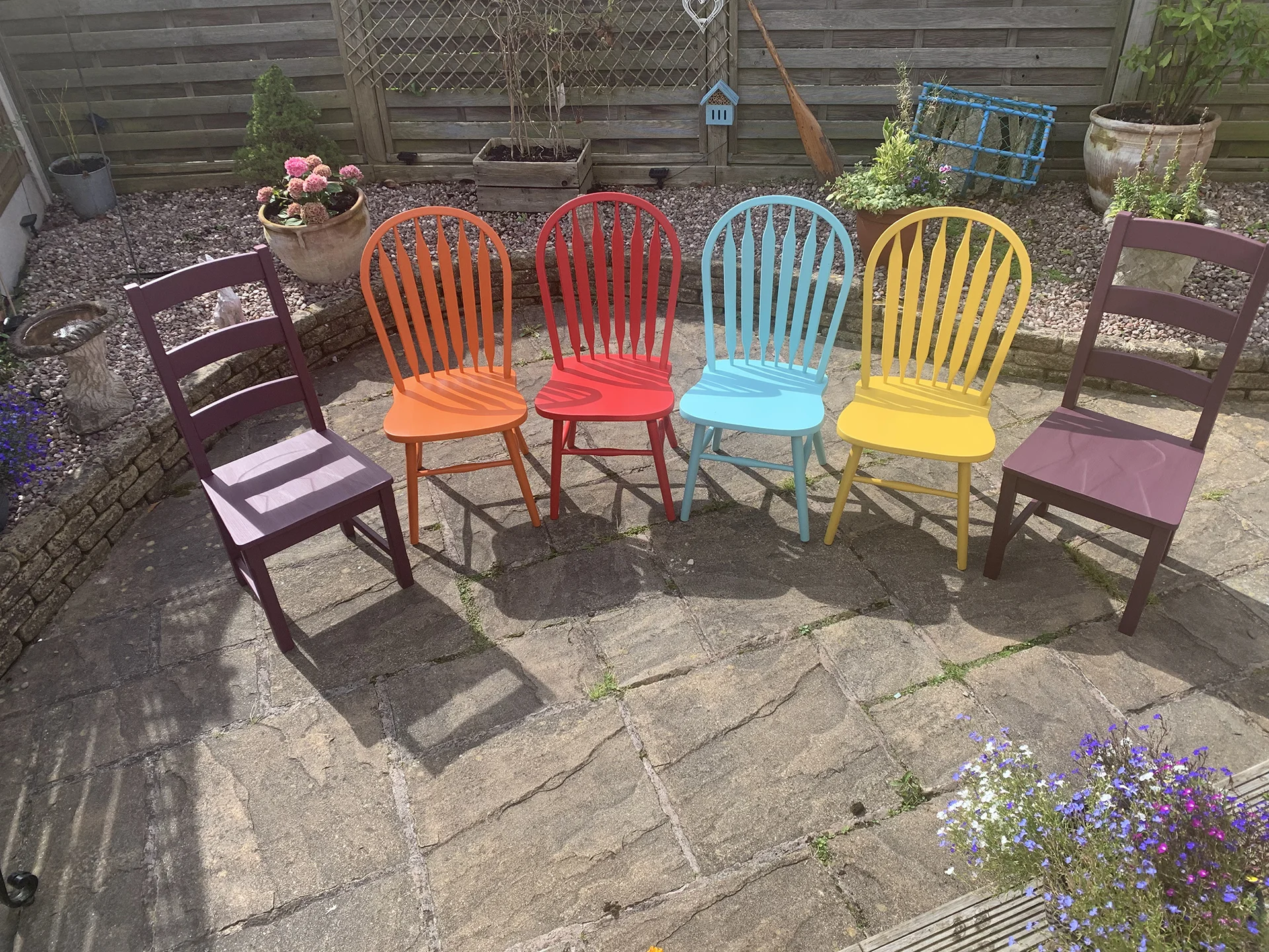 We followed our usual process – gave each chair a proper sand down and clean, then applied one coat of primer and undercoat. After that, three coats of colour to get that lovely rich finish, and finally two coats of clear, hard-wearing varnish to make sure they’ll last for years.