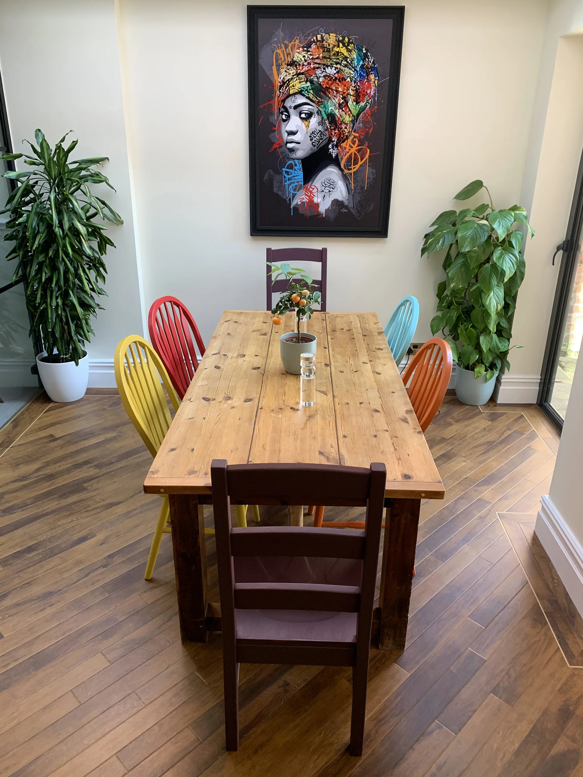 Mr T was absolutely chuffed with how they turned out! The combination of the vibrant chairs and his beautiful painting looks absolutely fantastic together. It’s transformed his dining room into somewhere really special, and we’ve saved six more pieces of furniture from ending up in landfill.