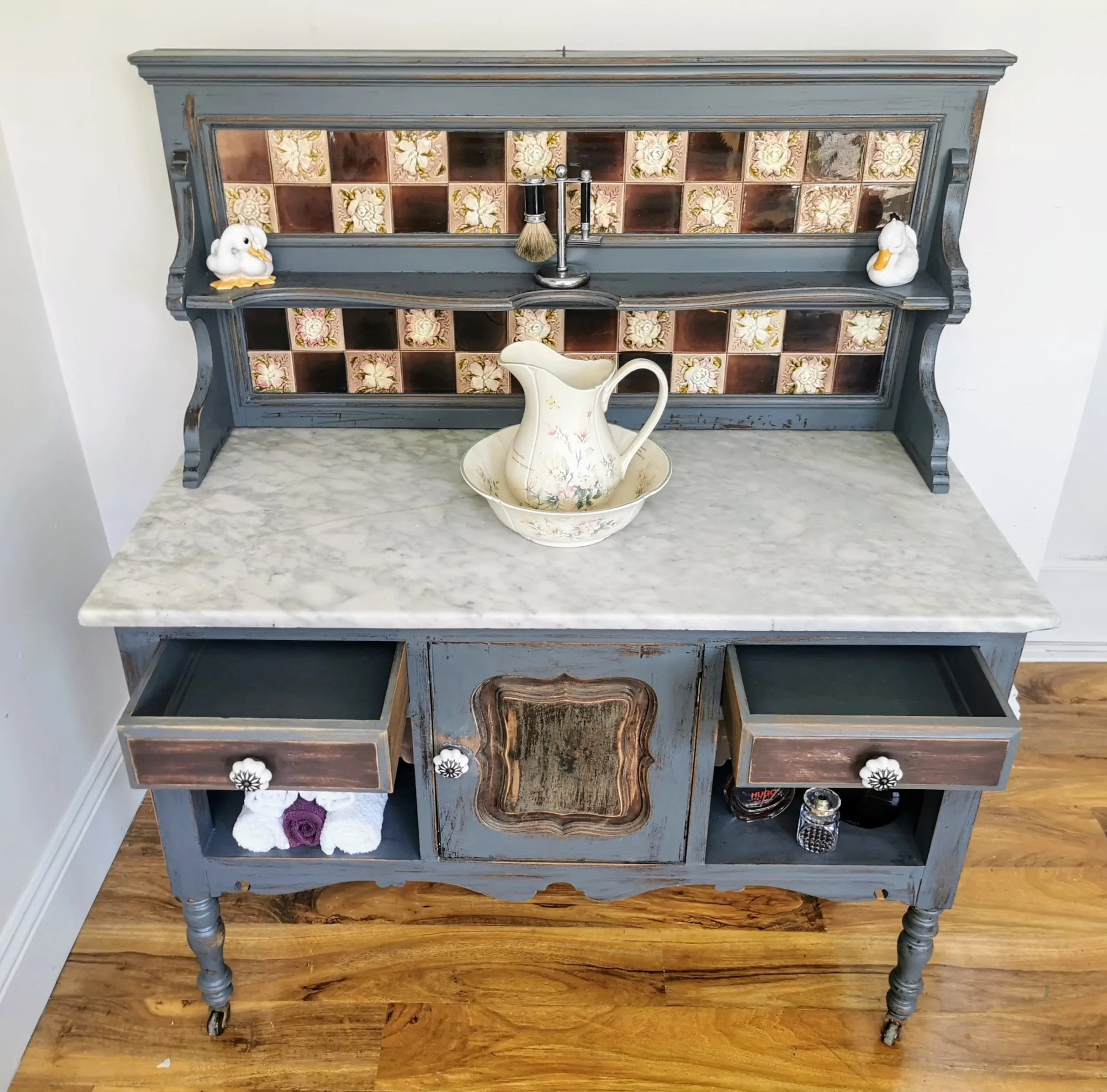 The washstand boasts a solid grey and white marble top, beautifully contrasted with its soft paint tones, and is framed by curvaceous Edwardian woodwork. The standout feature? Its original pearlescent floral tiles—still in fantastic condition and full of charm. With two drawers, a central cupboard, two open shelves, and a lovely ornate top shelf, there’s ample storage space, making this piece as functional as it is beautiful.