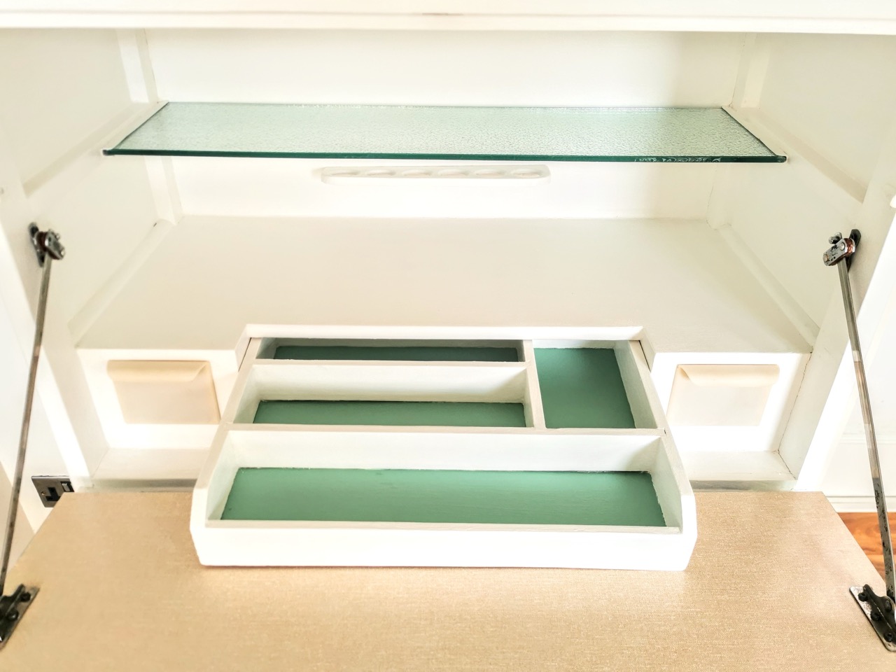 We stripped back the layers of old paint and got to work restoring the original hardware, bringing back its charm while staying true to the retro roots of the piece. Once cleaned and prepped, we repainted the unit in a striking combination of Farrow & Ball’s All White and Arsenic – a playful, classic pairing that instantly gave the piece a proper 60s vibe.