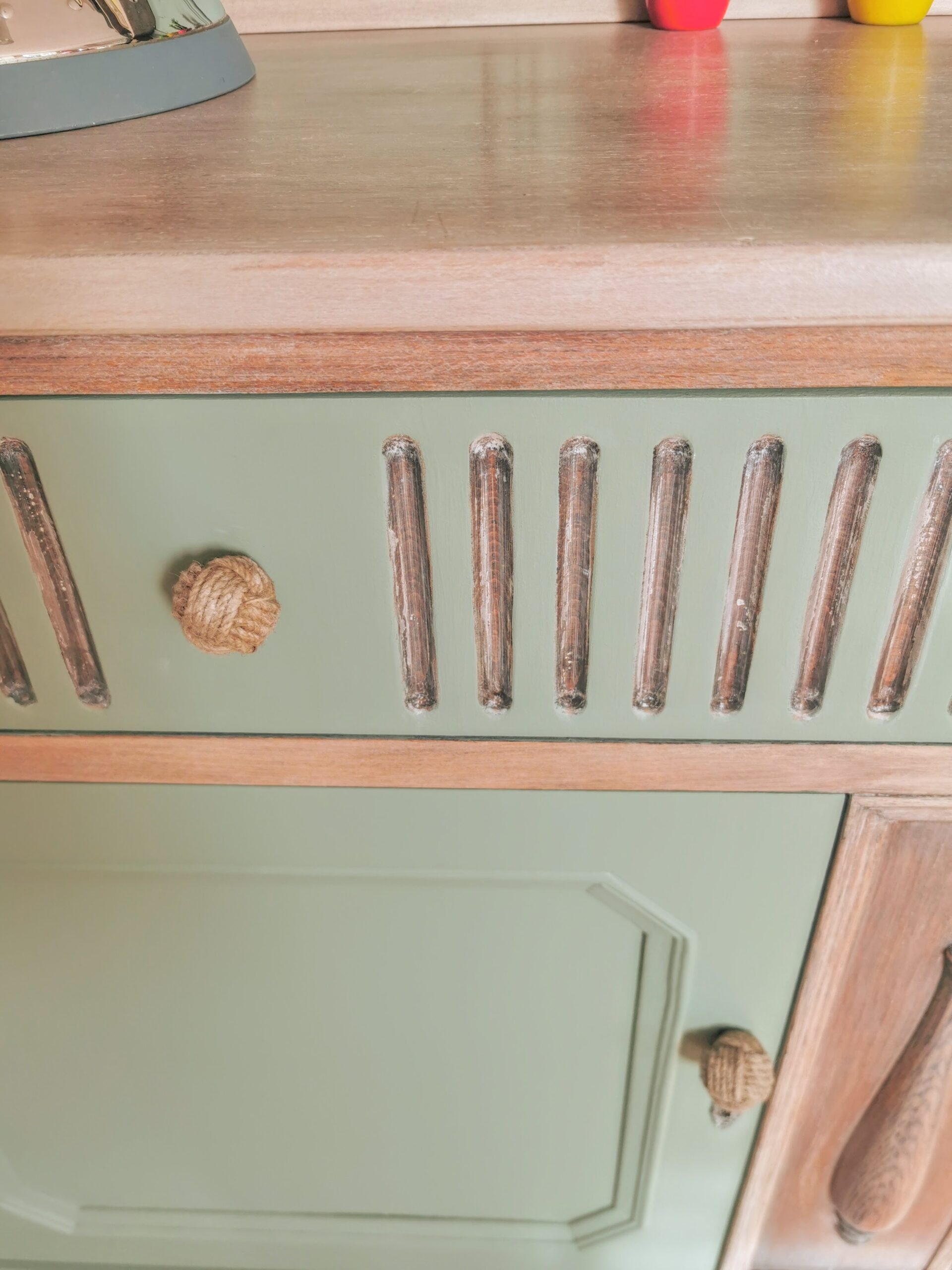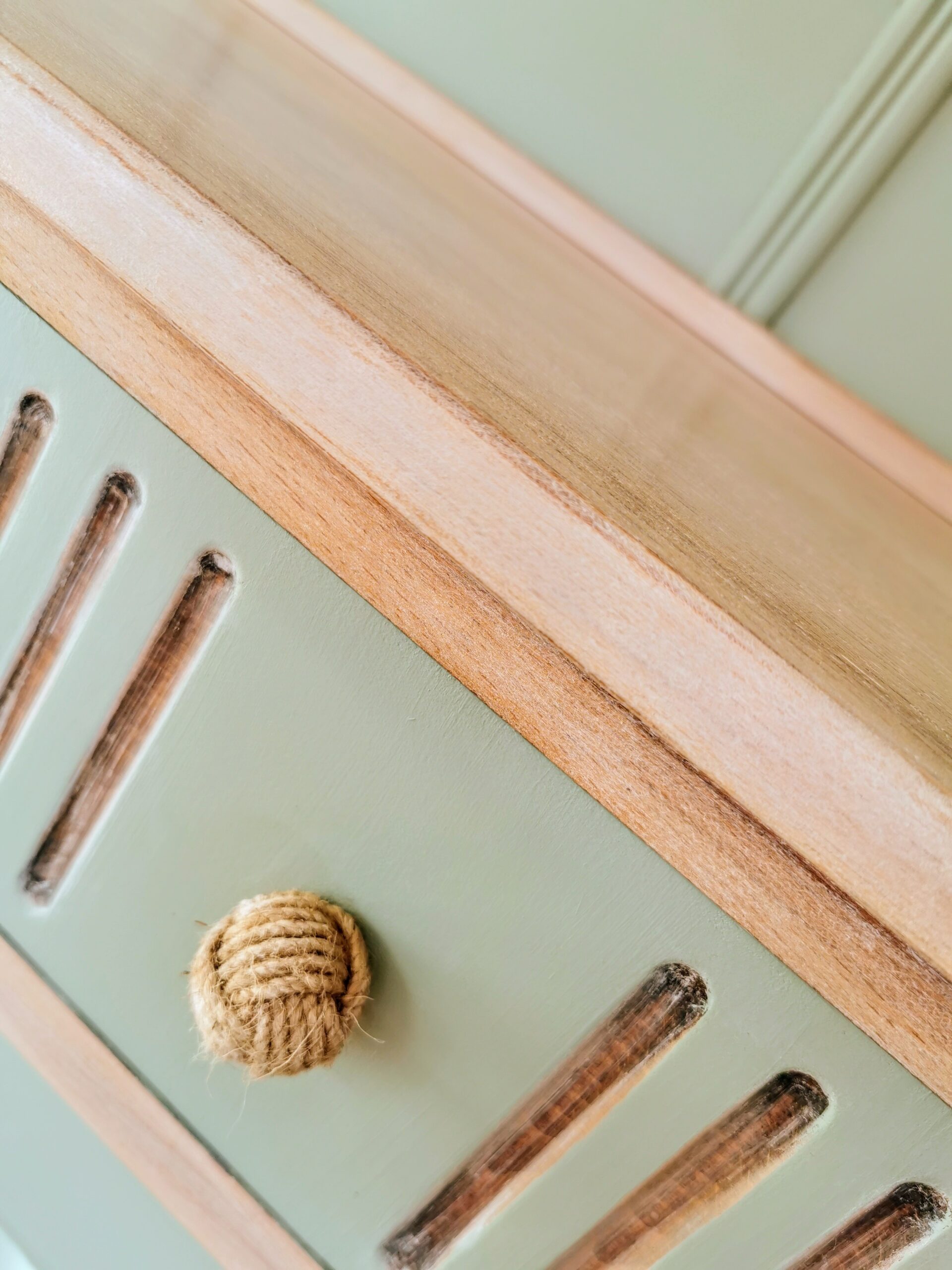 To give it a new lease of life, we fully stripped, cleaned, and sanded the wood before applying a custom blend of Frenchic paints, resulting in a soft whitewashed sage green. The rest of the exposed wood has been treated with white wax, enhancing the natural grain and creating a washed-out, seaside feel that inspired the piece’s ‘Beachcomber’ theme. The addition of rustic rope handles perfectly complements this look, bringing it all together in a subtle nod to New England coastal style.
