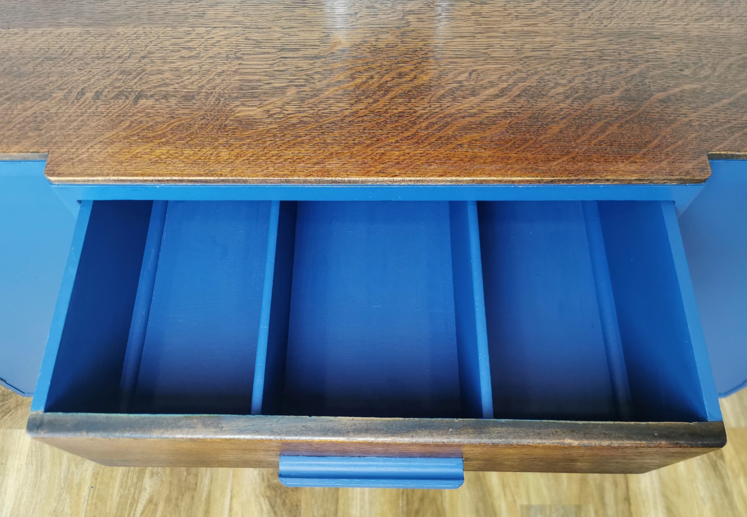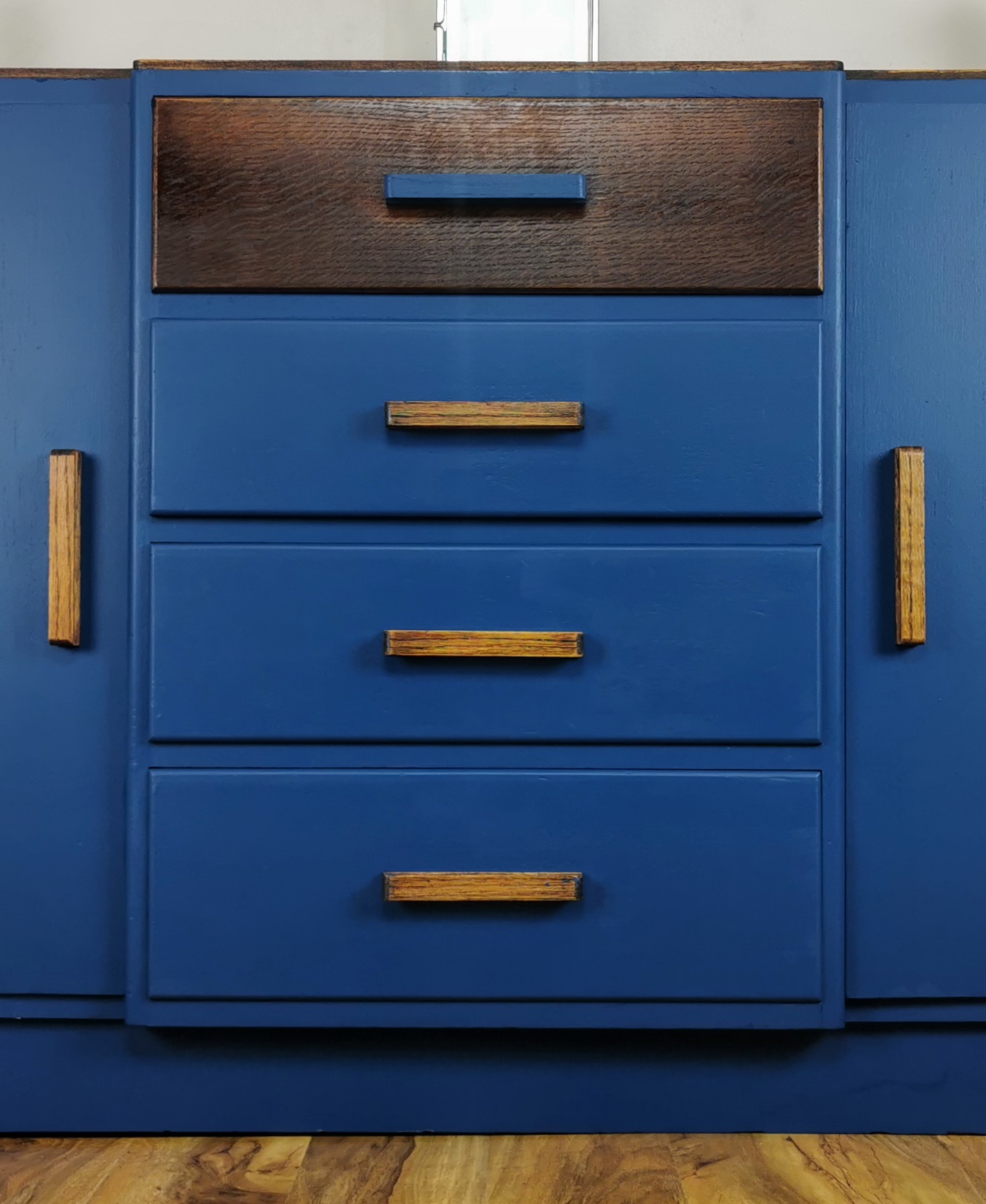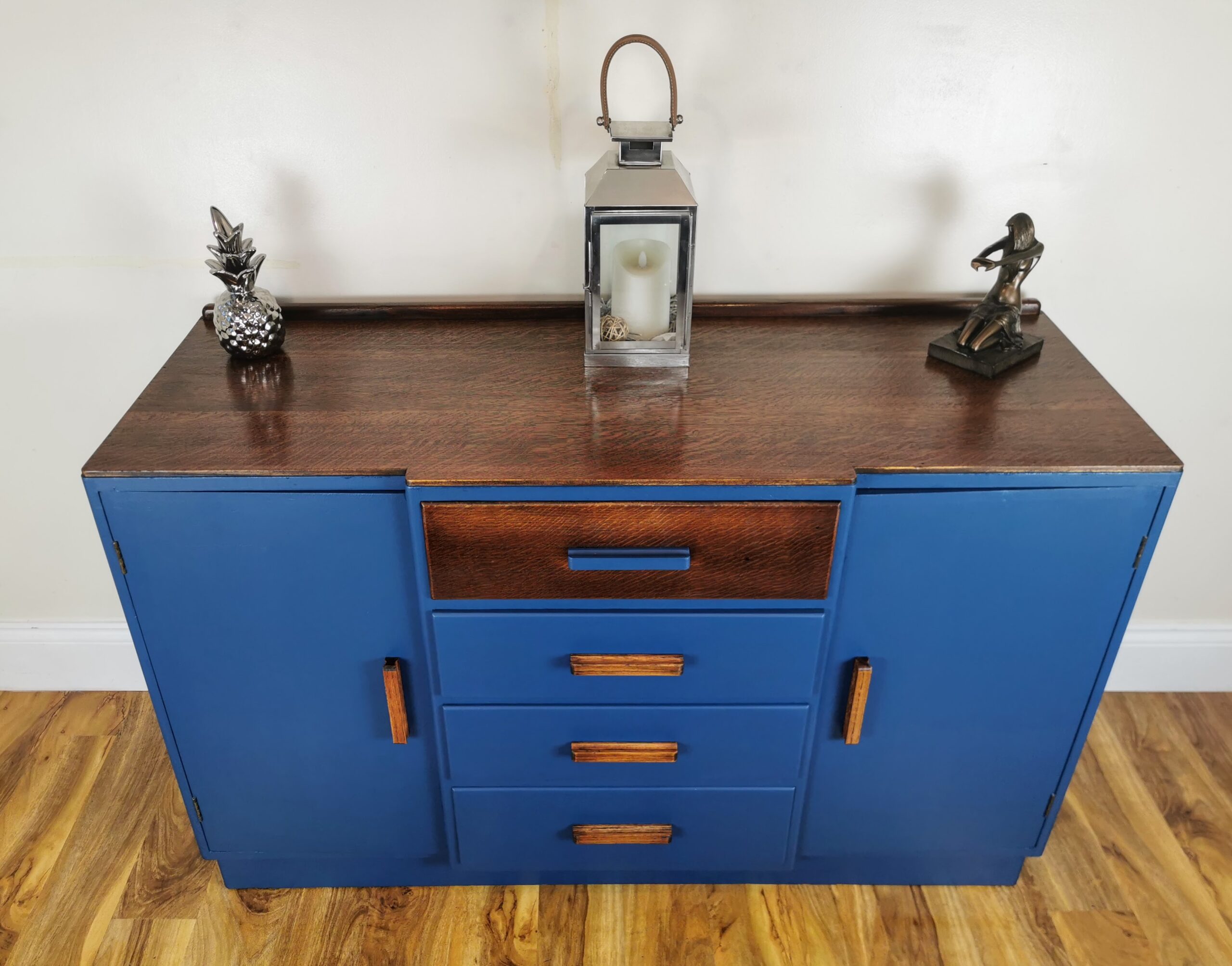 After a careful clean and strip-down, we revealed the original wood grain, enhancing its warmth and texture with clear wax for a natural, glowing finish. We then added a fresh update by painting select areas inside and out in Frenchic’s ‘Steel Teal’, a beautiful modern shade that complements the wood perfectly. The original drawer knobs were kept and refreshed with Rustoleum Titanium Silver, adding just the right amount of sparkle without losing the dresser’s vintage charm.