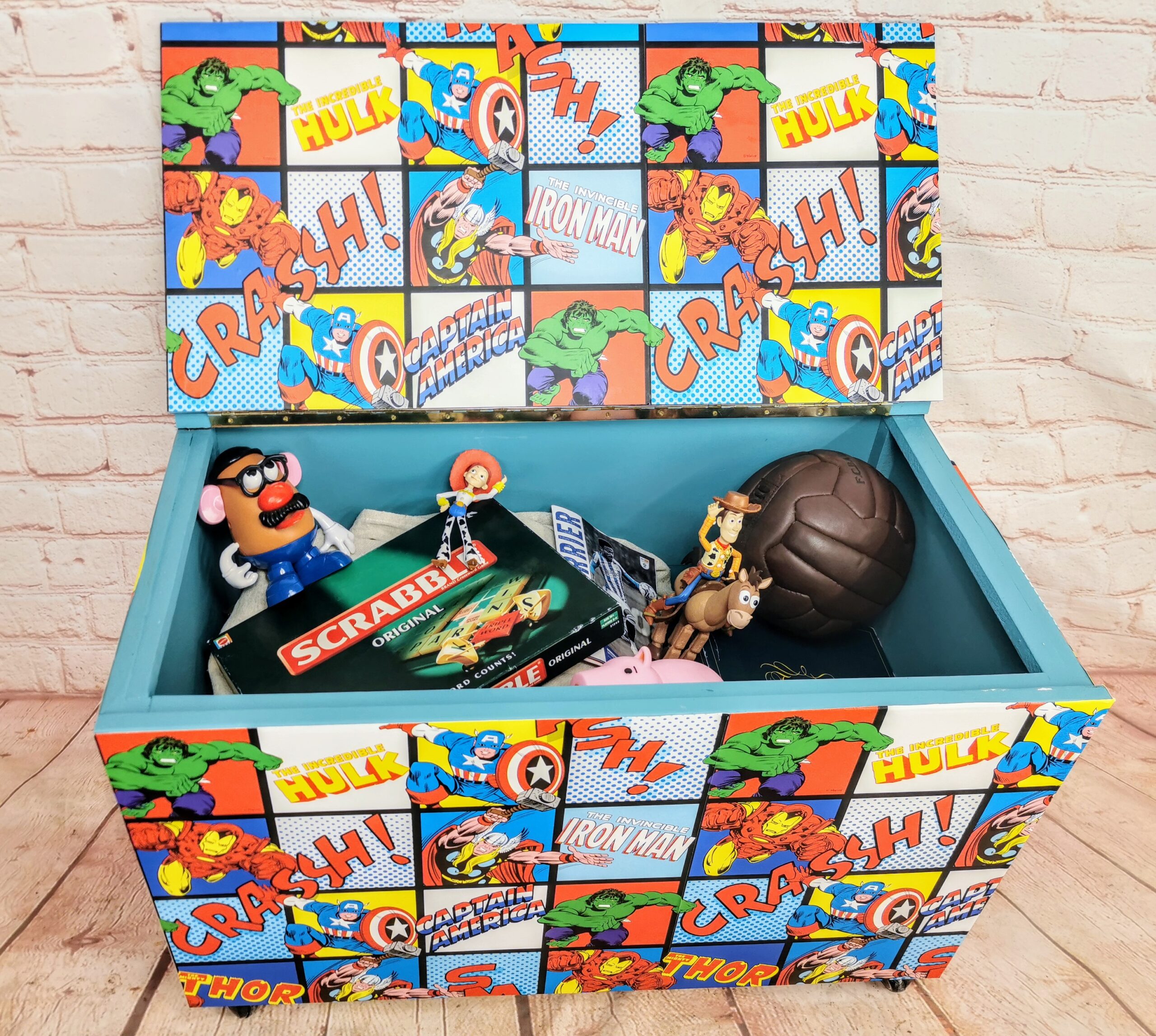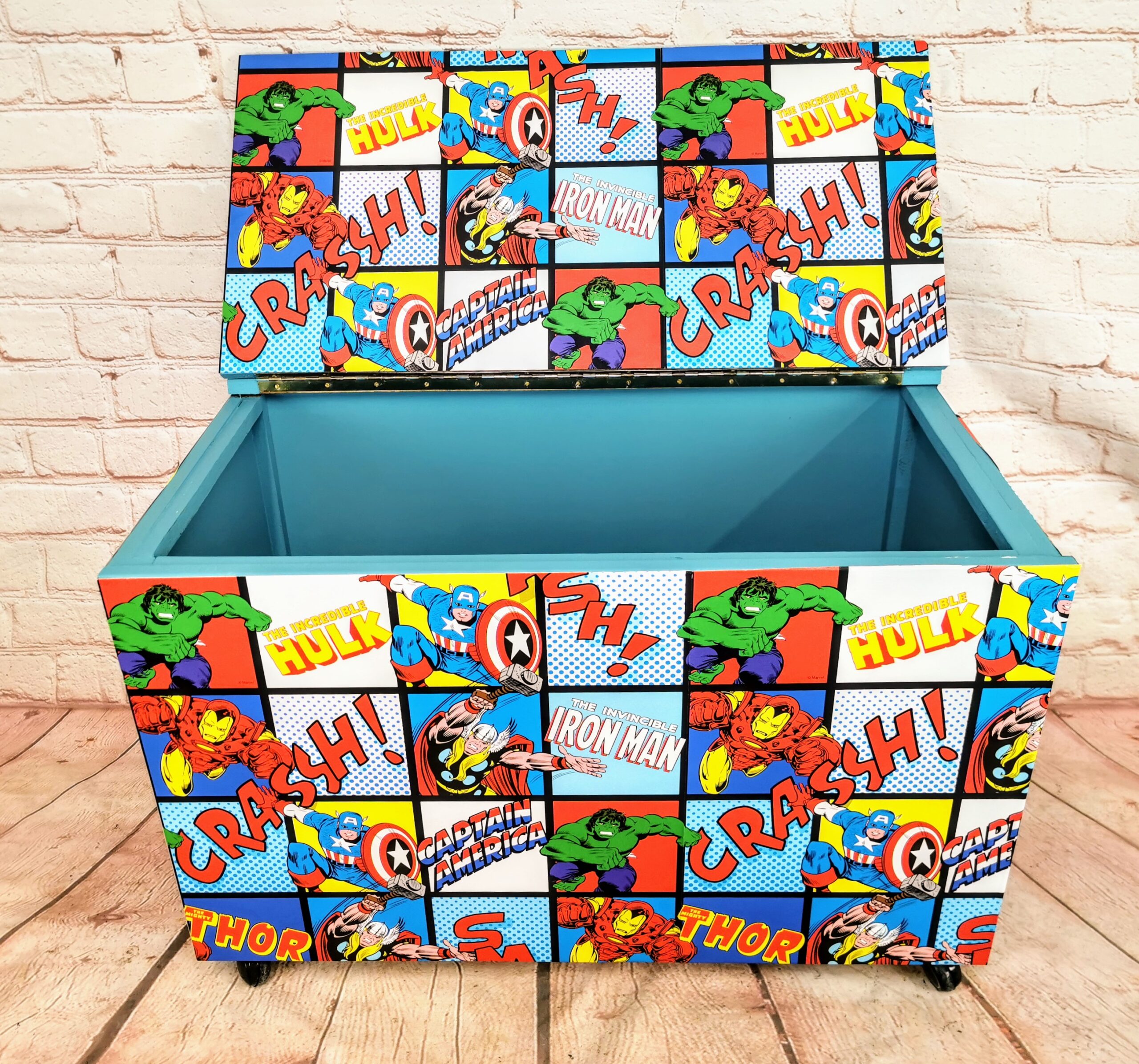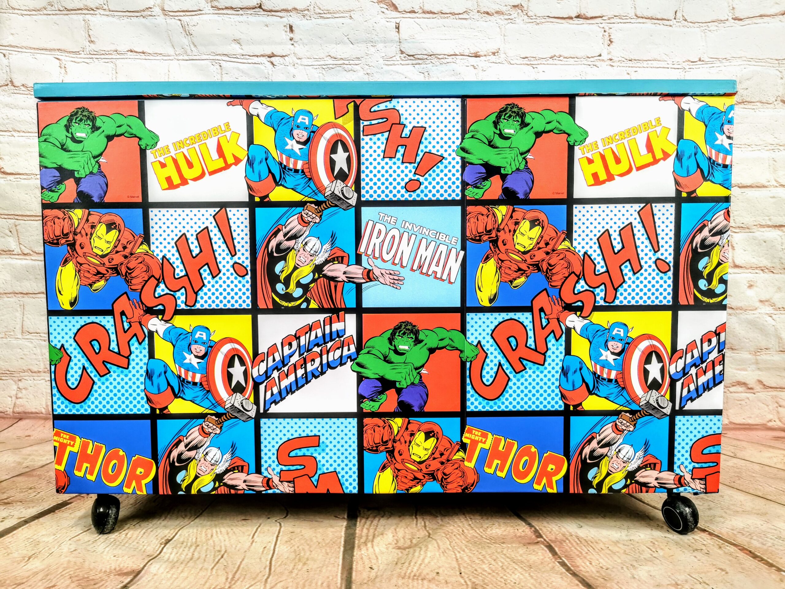 To take it to the next level, the box is wrapped in Marvel Comics Superhero wallpaper, featuring iconic characters and classic comic strip styling. It’s all been carefully sealed with multiple coats of finishing coat, ensuring it’s durable enough to handle everyday use in busy family spaces.